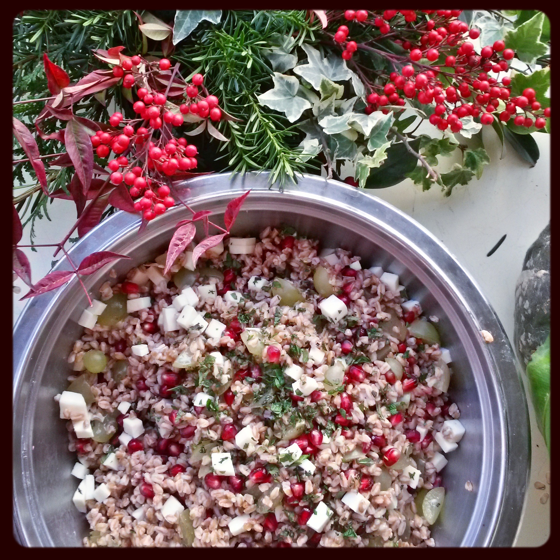 300g di farro — un melograno — due grappoli di uva bianca — 300g di mozzarella o feta — un mazzetto di menta — olio EVO — un dado — sale — pepe