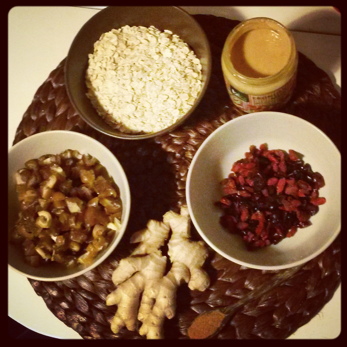 180g datteri — 60g mix frutti rossi disidratati e bacche di goji — 100g avena — un cucchiaio di burro di arachidi (mi raccomando senza oli idrogenati o olio di palma) — zenzero — cannella